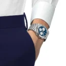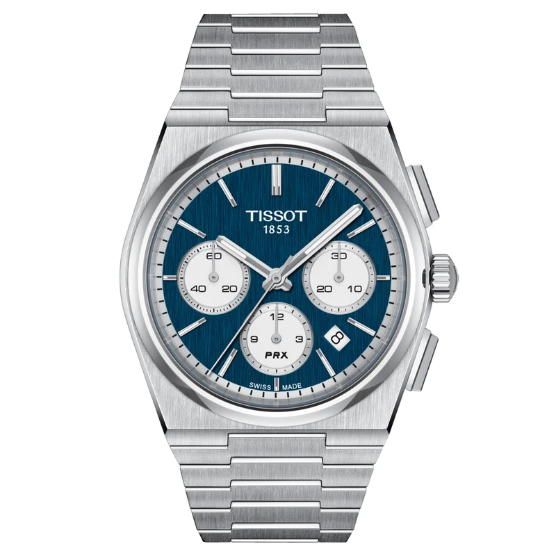 کمتر کسی در دنیا وجود دارد که نام کمپانی ساعت سازی سوئیسی تیسو را نشنیده باشد و علاقه مندان به ساعت هم میدانند بالاترین سطح ساعت سازی ، معرفی ساعت های اتوماتیک کرنوگراف میباشد که از پیچیدگی فنی بالایی بهره میبرد.حال به معرفی جدید ترین ساعت تیسو یعنی PRX اتوماتیک کرنوگراف با صفحه خیره کننده آبی میپردازیم. عقربه های کرنوگراف و ثانیه شمار این ساعت درون دایره ای سفید رنگ قرار گرفته که به این سبک چینش و رنگ بندی پاندا میگویند.بند ساعت از استیل 316 براش خورده مات میباشد که در زاویه های گوشه اش پولیش خورده و براق است.میپردازیم به ویژگی های فنی این ساعت.این ساعت از موومنت ETA Valjoux A05.H31 استفاده میکند و تا 60 ساعت توانایی ذخیره انرژی دارد. درون موتور این ساعت 27 جواهر قیمتی استفاده شده است که طول عمر این ساعت را بسیار بالا میبرد.شیشه از جنس یاقوت کبود ضد خش و مقاومت در برابر آب تا عمق 100 متر معادل شنا در استخر از دیگر ویژگی های این ساعت میباشد.